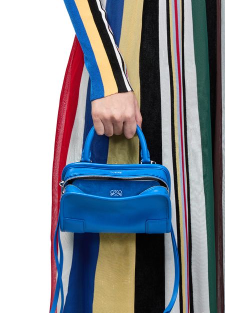 Reveal the mini Amazona 180 bag in soft calfskin, a piece that revisits one of LOEWE’s most storied bags, taking on a relaxed silhouette anchored by a single toron top handle. It is designed to be carried open, while a concealed closure secures the main compartment. Removable shoulder and crossbody straps make it highly versatile.