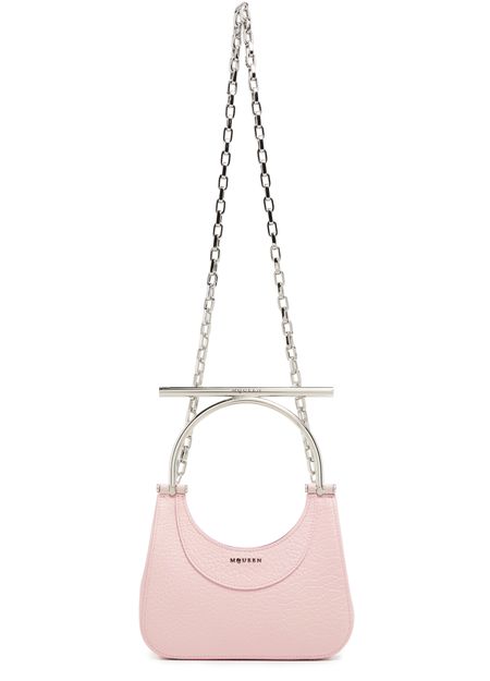 McQueen's mini T-Bar bag exudes sophistication with its magnetic closure and silver finish. Hand carried by a single handle, it showcases a front logo in silver letters. The interior pocket adds practicality, while visible topstitching and a thin strap enhance its refined design, making it a must-have accessory.