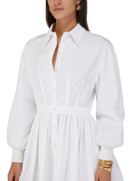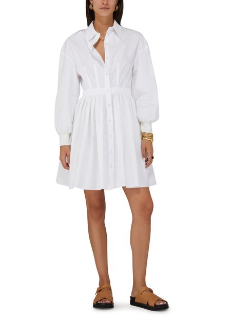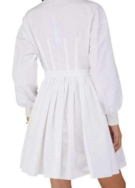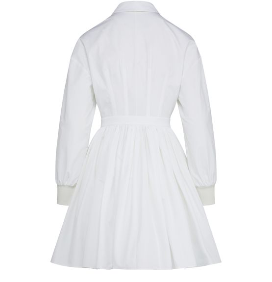 Alexander McQueen's mini dress features a classic collar and front buttoned closure. The cuffs and visible stitching add a touch of sophistication, while the asymmetric front pleats create a modern and stylish silhouette. Perfect for both formal events and casual outings, this dress is a versatile and timeless addition to any wardrobe.