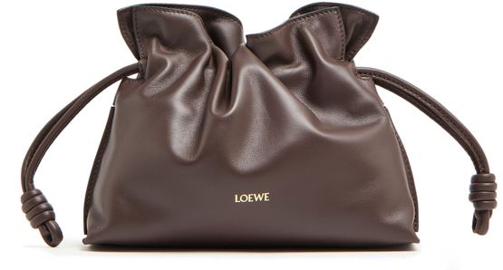 Loewe's Mini Flamenco clutch features a front logo in silver letters and a drawstring closure. It can be hand carried with its thin strap or worn on the shoulder or crossbody with the detachable strap. This versatile bag is perfect for adding a touch of elegance to any outfit.