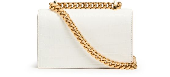 Reveal the exquisitely designed Alexander McQueen Mini jewelled satchel. Crafted from crocodile-embossed leather, this mini bag features a gold clasp with flap closure, and a chic chain strap. Inside, discover functional elegance with single compartment and card slots, all finished with luxurious gold accents.
