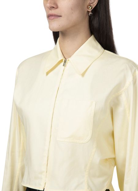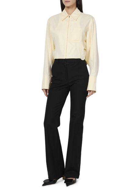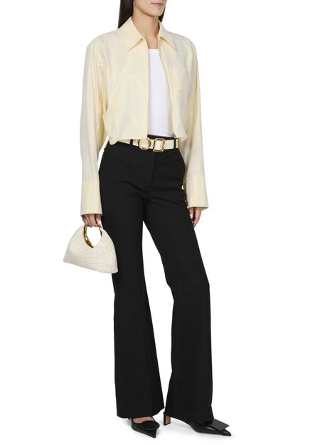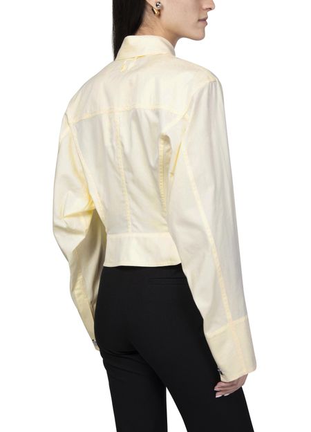 Jacquemus's Mirada shirt showcases a chic cropped silhouette with long sleeves and buttoned cuffs. Its shirt collar frames the face, while patch pockets and a breast pocket add functionality. The appliquéd logo and visible stitching accentuate its unique design, making it a standout piece for stylish layering.
