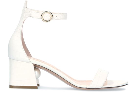 The Miri sandals are designed by Nicholas Kirkwood. Made in calfskin leather with a crocodile finish, they feature a curved heel with the fashion house's signature pearl.