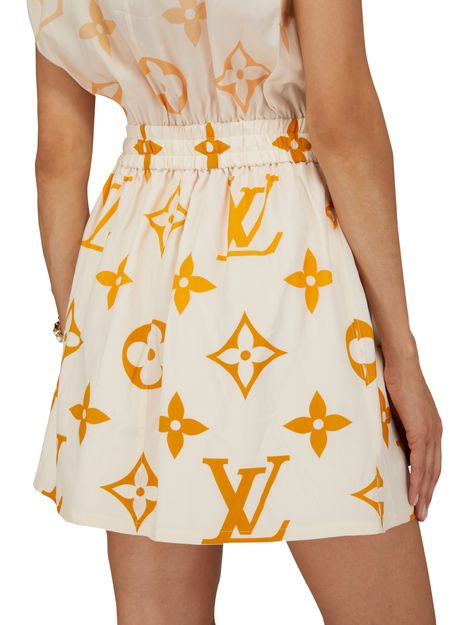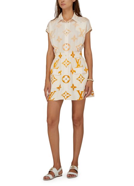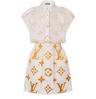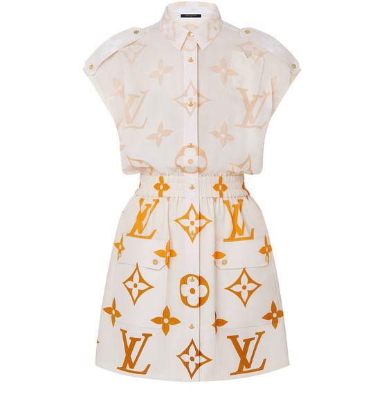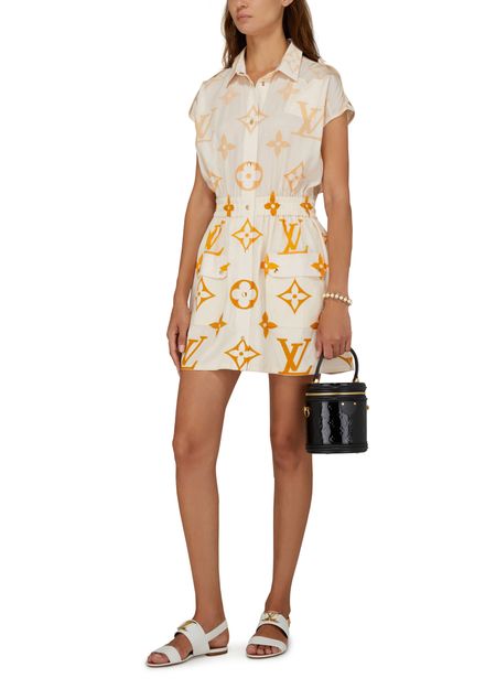 Brass hardware punctuates this sleeveless silk shirt dress, adding a dressy military edge to the laid-back look. The sharp collar, shoulder tabs and sleek flap pockets underscore the uniform feel, while an allover macro Monogram print in a cheerful gradient boosts the summer spirit. The relaxed silhouette is given definition by an elasticated waistband.