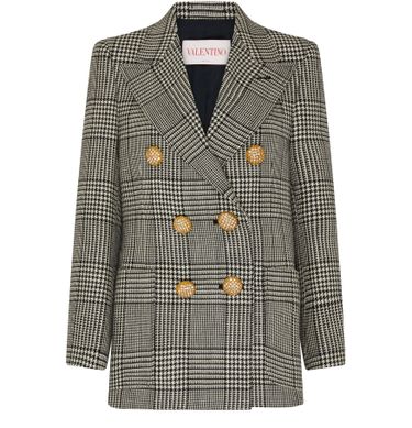 Valentino's Mossi double-breasted jacket showcases a sophisticated checked pattern, enhanced by a striking gold finish. Its notched collar and long-sleeved design offer elegance, while patch and side pockets add functionality. This statement piece effortlessly combines style and practicality, making it a must-have for any fashion-forward wardrobe.