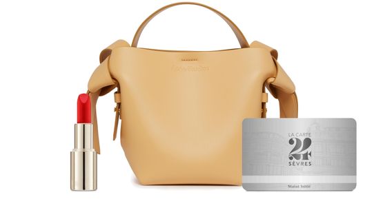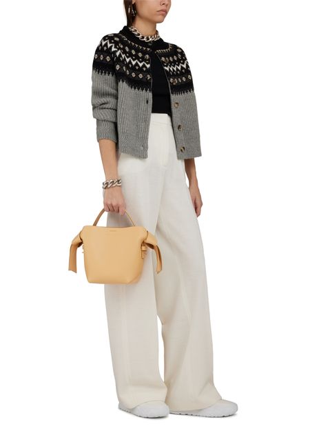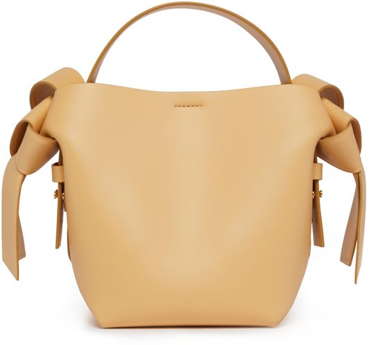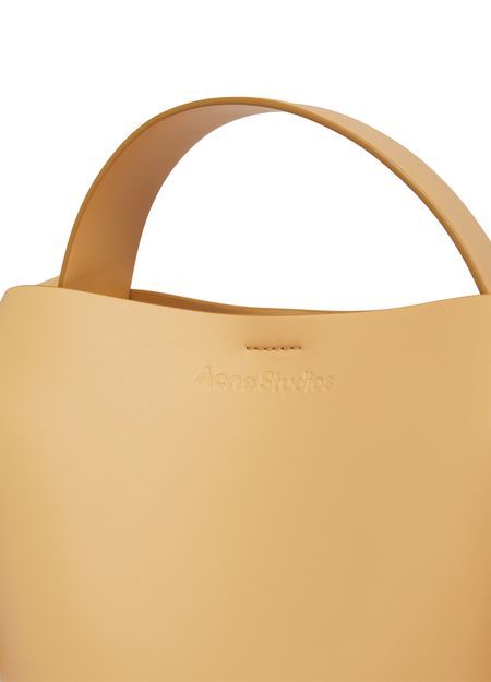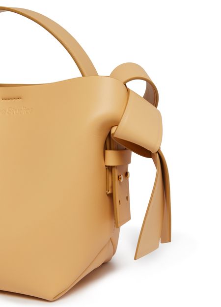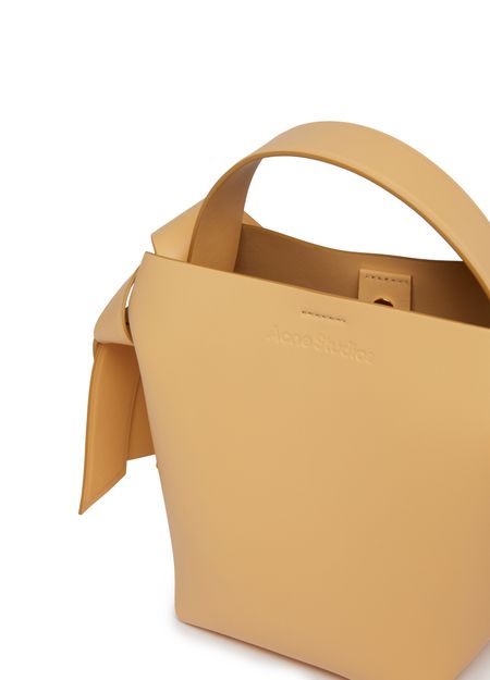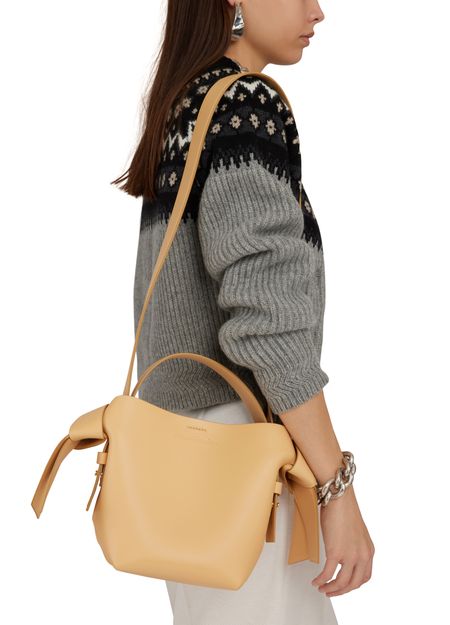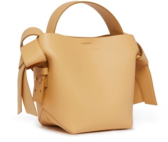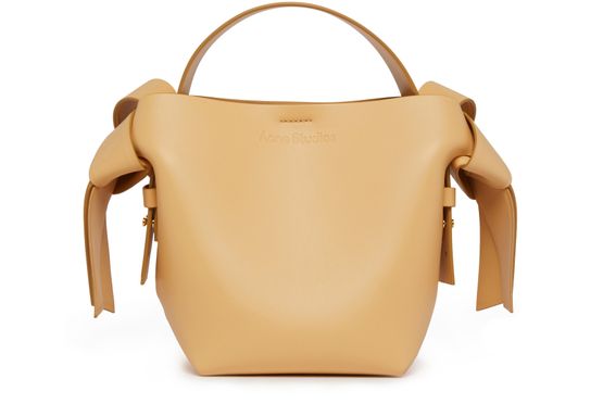 Acne's Musubi mini bag is a versatile accessory with an adjustable, detachable strap for various carrying options. It can be hand carried, worn on the shoulder, or across the body. The bag features a handle on the back and a zippered interior pocket for organization.