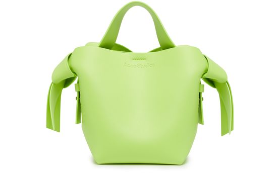 Acne's Musubi mini bag is a versatile accessory with an adjustable, detachable strap for various carrying options. It can be hand carried, worn on the shoulder, or across the body. The bag features a handle on the back and a zippered interior pocket for organization.