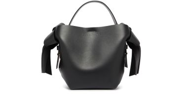 Acne's Musubi mini shoulder bag features a single compartment and a wide strap for wearing on the shoulder. The printed logo on the front is accented by silver lettering for a sleek, modern look. The silver finish adds a touch of sophistication to this stylish and versatile accessory.