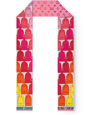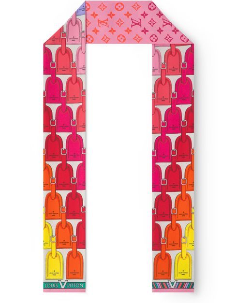 The My LV Tags bandeau introduces a striking new print inspired by travel. One side of the design features a graphic composition of Louis Vuitton luggage tags, while the reverse is decorated with a gradient Monogram pattern. The pure silk textile accessory also features a contrasting border that nods to the LV Vitesse logo.