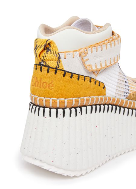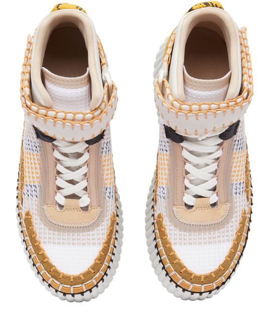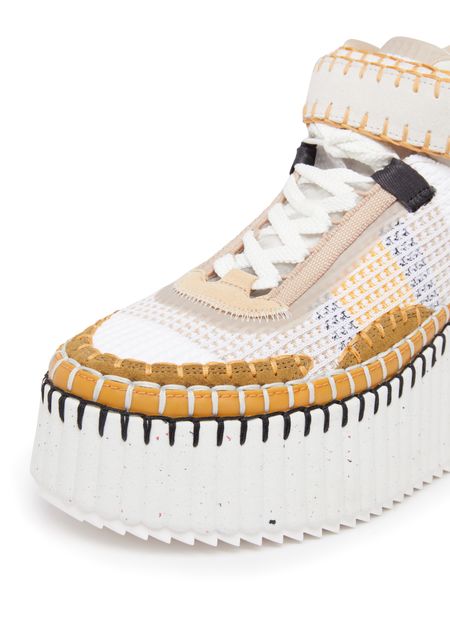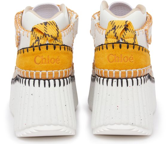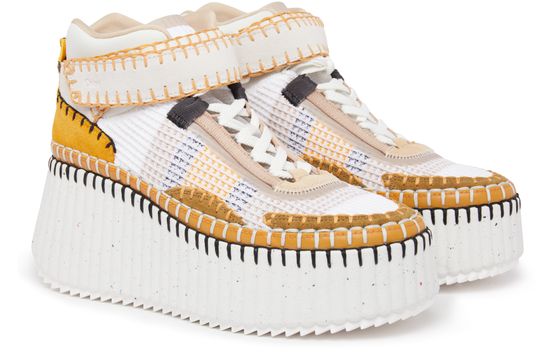 The Chloé Nama sneaker is a stylish pair of lace-up shoes with a high-top upper and a loop at the back for easy slipping on and off. The thick, notched sole provides excellent traction and durability, while the visible stitching adds a touch of sophistication. Perfect for any casual occasion.