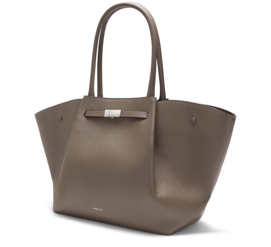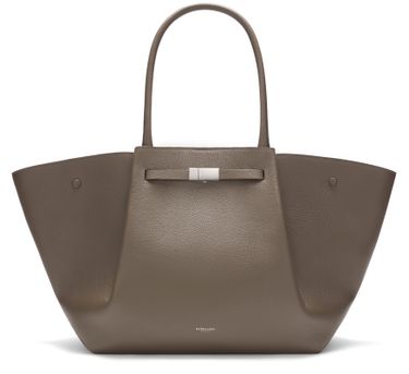 Introducing Demellier's The New York handbag, a refined shopper bag crafted with a magnetic closure and a single compartment for effortless organization. Its gold finish, double handles, and front logo exude sophisticated flair, while the zippered interior pocket and thin strap provide versatile carrying options.