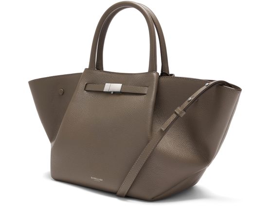 Reveal Demellier's The Midi New York handbag, crafted from grained leather with double handles and a thin, adjustable strap for versatile wear. The front logo, visible stitching, and silver finish add refined detail, while spacious compartments and secure snap-button fastening ensure both style and practicality.