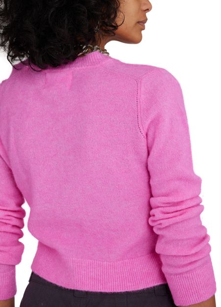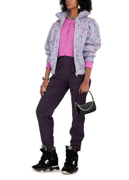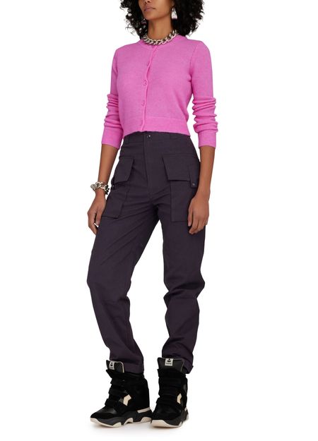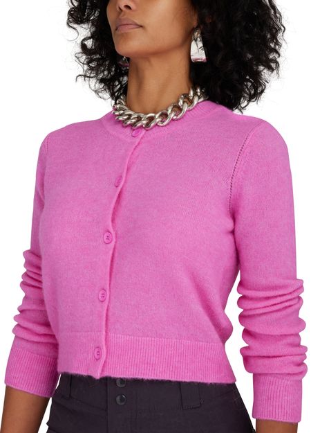 Isabel Marant Etoile Nita cardigan is a cozy and comfortable piece made from warm fabric. It features a classic crew neck and front buttoned closure, with cuffs and visible stitching adding a touch of detail. Perfect for layering during colder months.