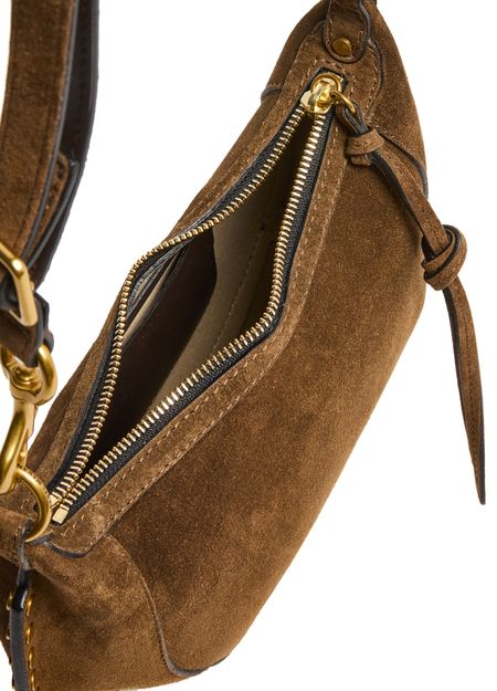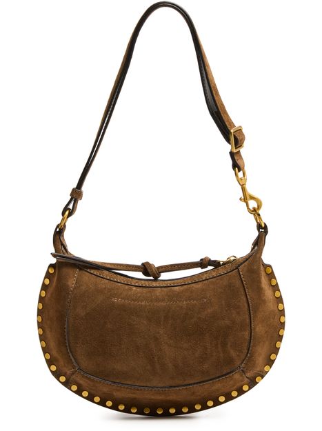 Reveal Isabel Marant's Oskan Moon bag, a stunning shoulder piece crafted from luxurious suede. This versatile accessory features an adjustable thin strap, allowing for both shoulder and crossbody wear. Adorned with visible stitching and studded details, it closes securely with a zipper, all gold-finish metal details in elegant gold.