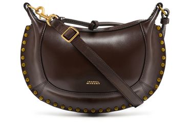 Reveal Isabel Marant's Oskan Moon bag, a stunning shoulder piece crafted from smooth leather. This bag features studded details and a single handle, offering both style and functionality. With a zipper closure, interior pocket, and visible topstitching, it embodies modern elegance with a metallic finish.