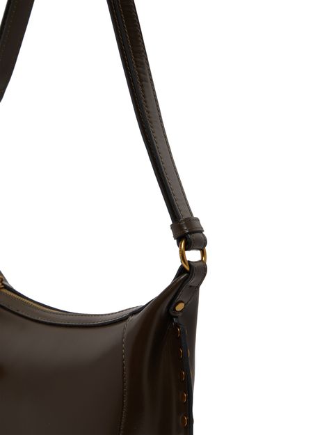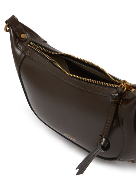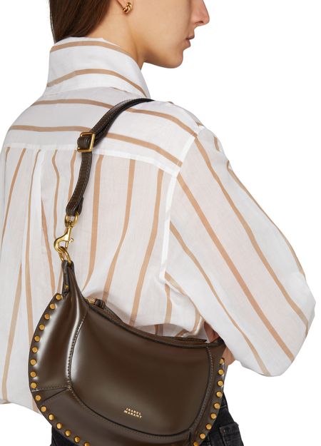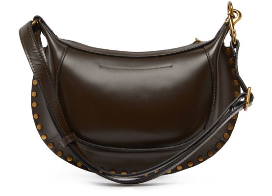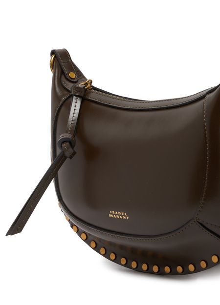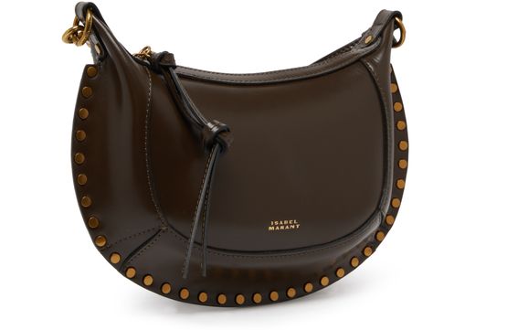 Reveal Isabel Marant's Oskan Moon bag, a stunning shoulder piece crafted from smooth leather. This bag features studded details and a single handle, offering both style and functionality. With a zipper closure, interior pocket, and visible topstitching, it embodies modern elegance with a metallic finish.