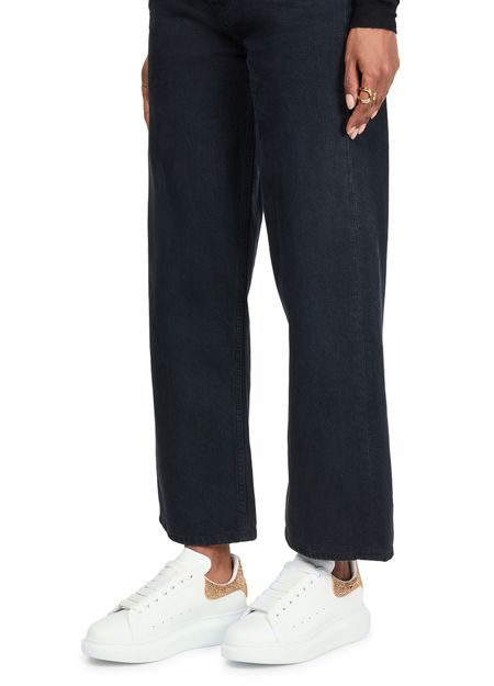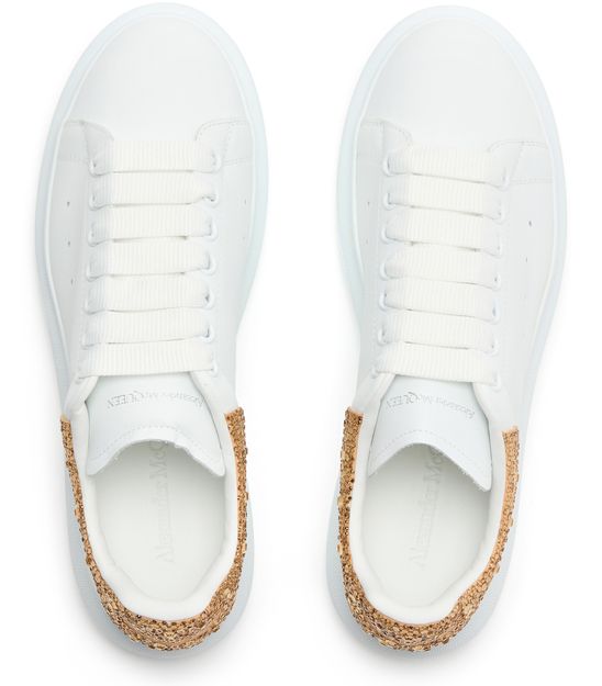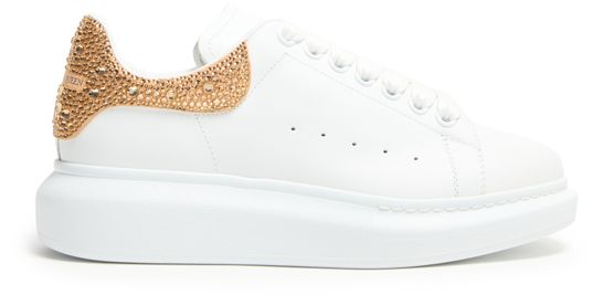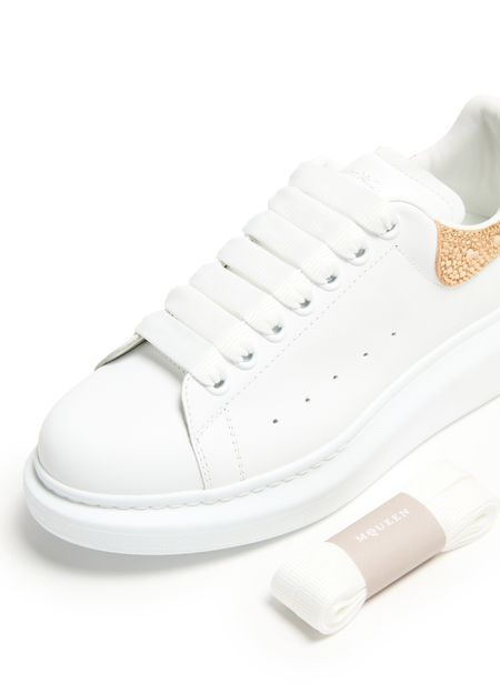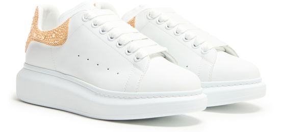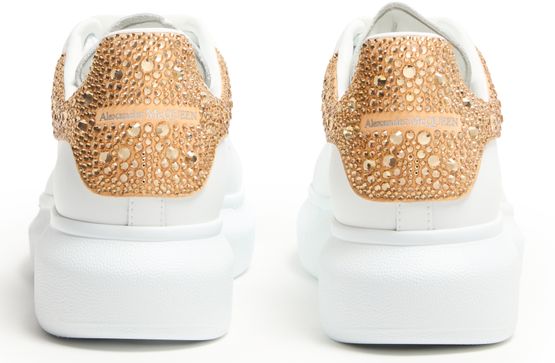 Unveil Alexander McQueen's oversized sneakers, a fusion of style and sophistication. These sneakers feature a round toe with a thick outer sole, adorned with visible stitching and a distinctive lace and strap closure. The sequin details and gold finish accentuate their modern appeal.
