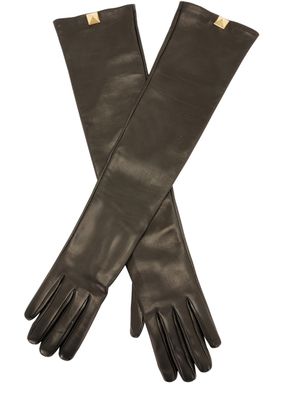 • Description : Long gloves, smooth leather, rockstud decorative studs, antique gold-toned metal finishes.