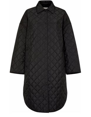 Padded coat is a knee length, long-sleeved outerwear with a padded texture. It features a front buttoned closure and button fastening for ease of wear. With side welt pockets, it offers functional storage options. The coat is detailed with a logo at the back label, adding a touch of branding to the design.