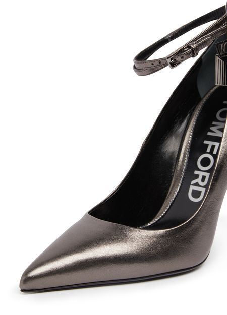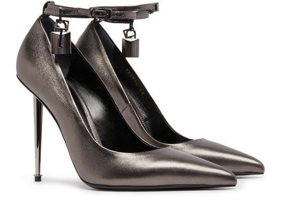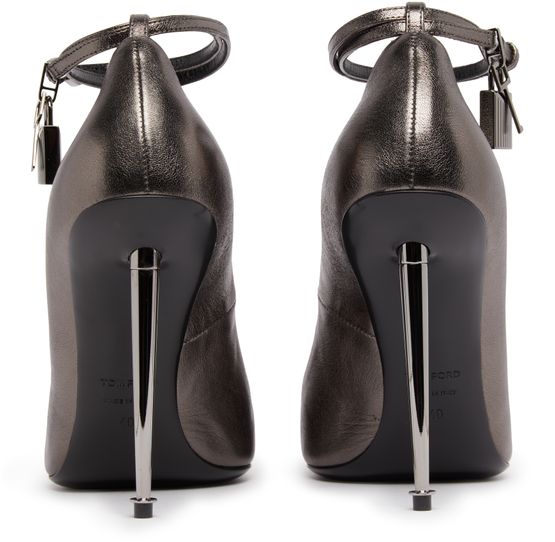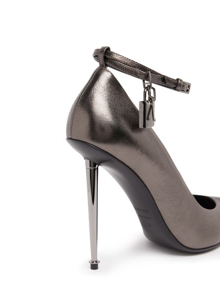 Tom Ford Distribution's Padlock pumps are a fashion statement with their sleek shape and pointed toe. The buckled ankle strap adds a touch of sophistication while the lamé effect and metallic finish give them a luxurious feel. The very thin sole and stiletto heel add a sexy and elegant touch.