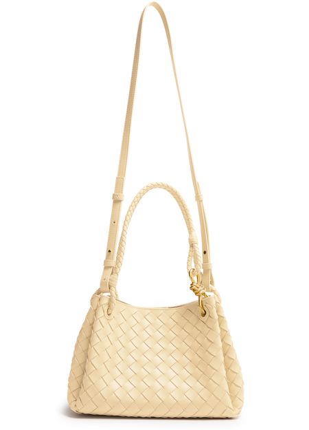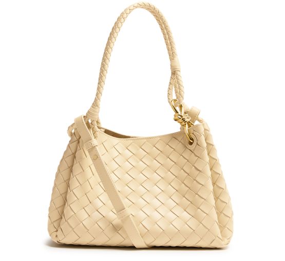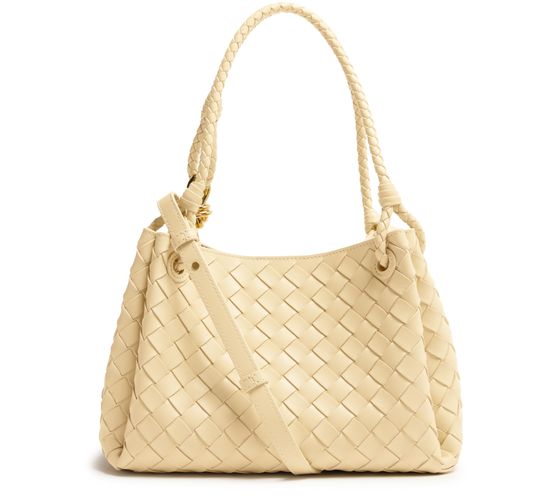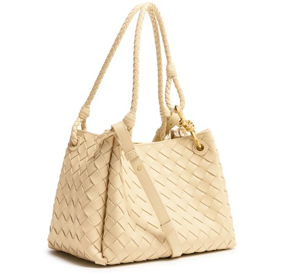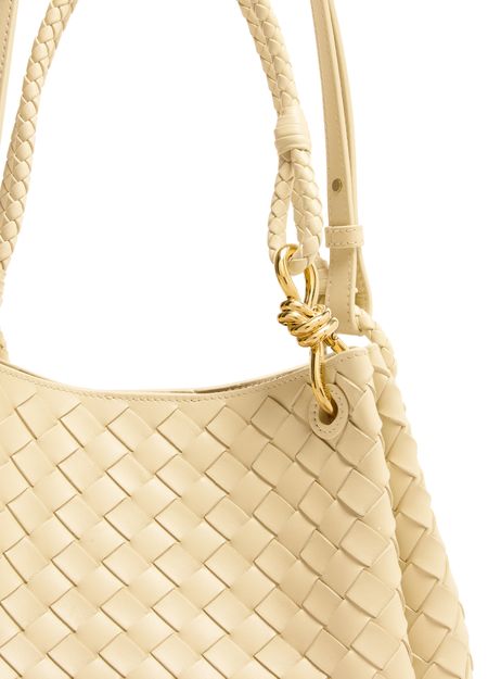 • Description : Shoulder bag, crossbody bag, intrecciato weaving technique, double handles, leather handle, thin strap, adjustable strap, magnetic closure, visible topstitching, gold finish.