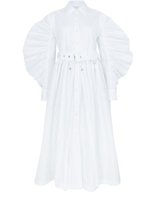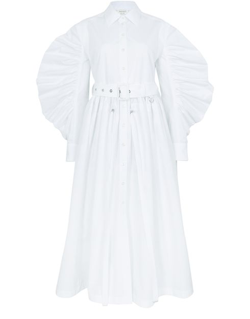 Accentuated with puffed sleeves and a flared cut, the midi-length Parka shirt dress by Alexander McQueen has a shirt collar and a gathered belted waistband.