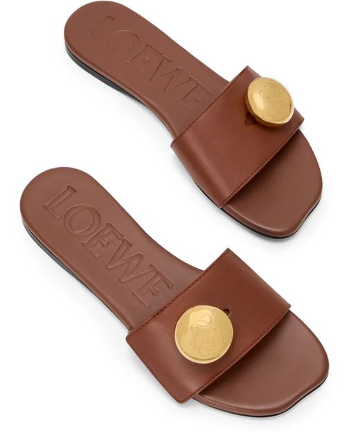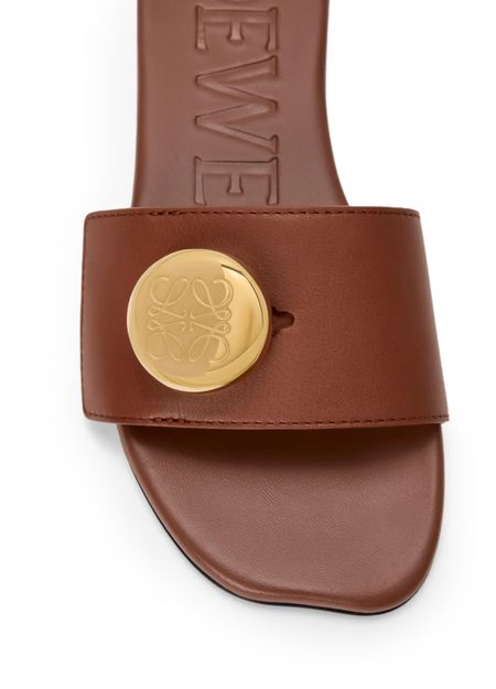 Unveil Loewe's sandals with a seamless blend of smooth leather and a distinctive peep toe. The square toe design complements the petal button element, while the Toy heel adds an avant-garde touch. Accentuated by visible stitching and a logo on the side, these sandals exude sophistication.