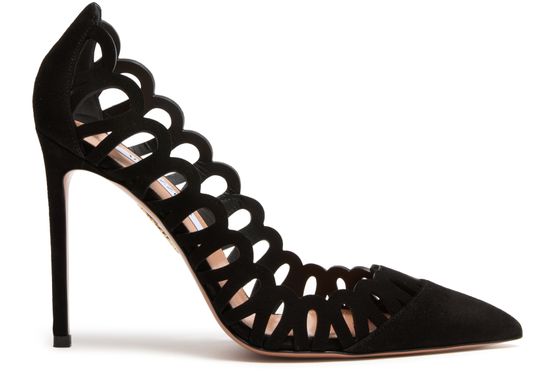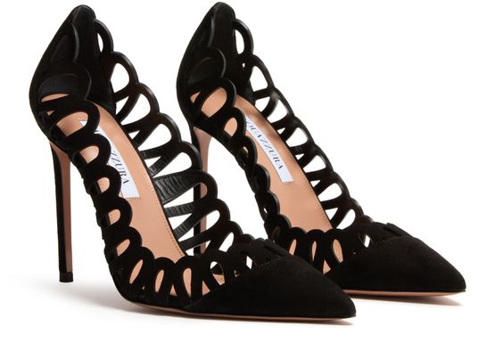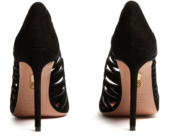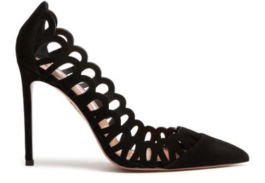 Reveal Aquazzura's Peep pumps 105 in a stunning suede construction. These high heel stiletto pumps feature a closed pointed toe for a sleek silhouette. Graphic cut-outs and a printed logo add an edgy touch, combining sophistication with modern elegance.
