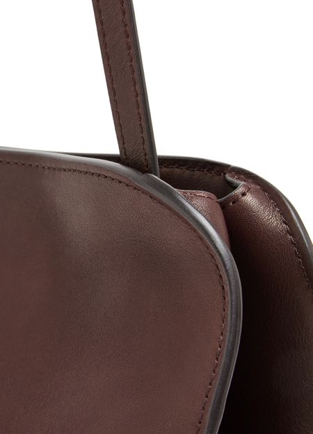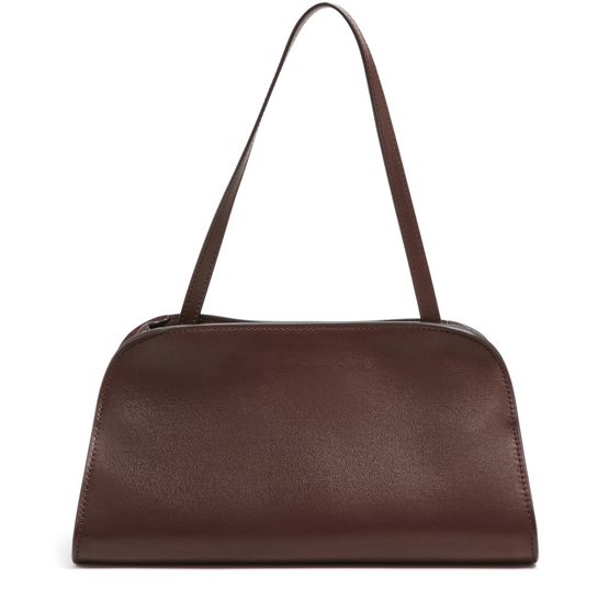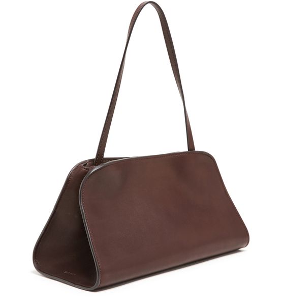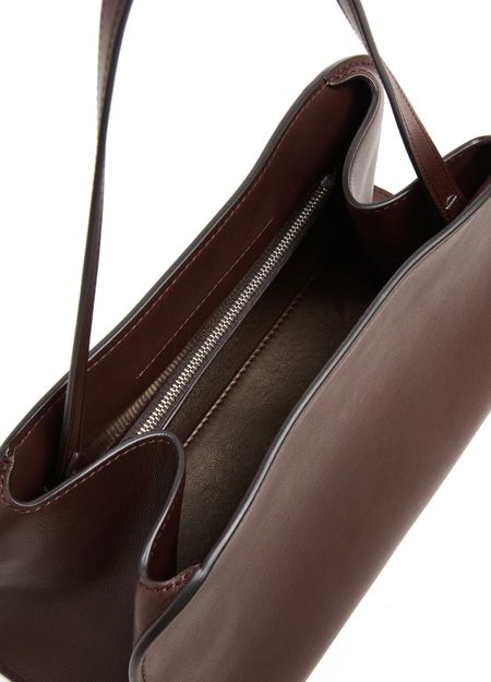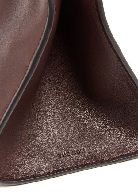 Reveal The Row's Peggy clutch, crafted from smooth leather with a refined single handle and thin strap. The spacious interior features a zippered pocket and is finished with visible topstitching and sleek metal accents, offering a sophisticated blend of style and practicality.