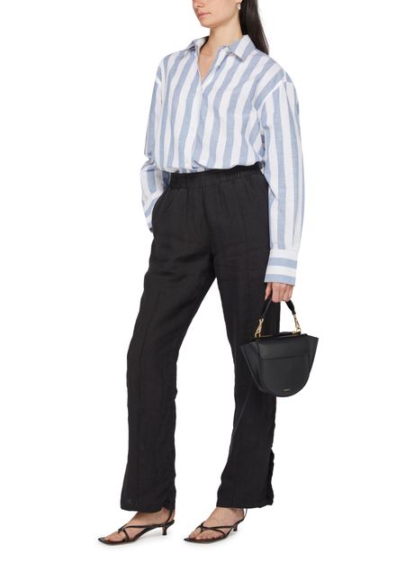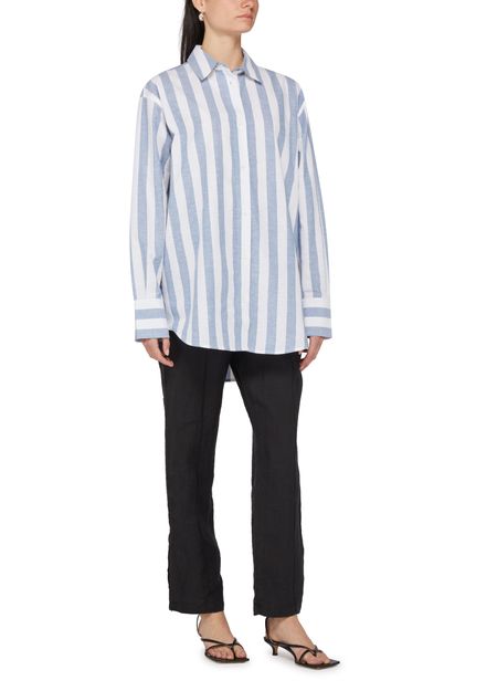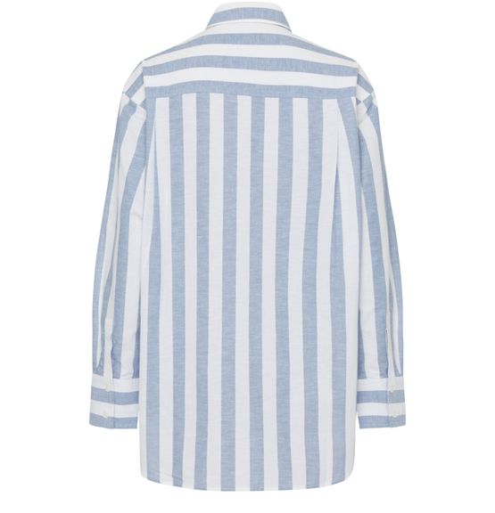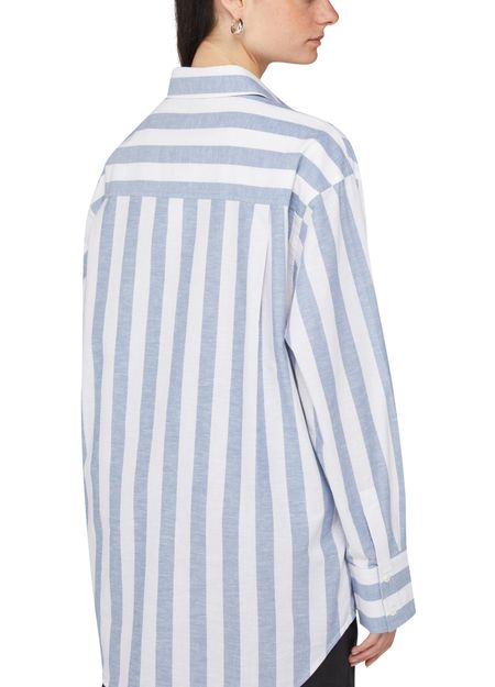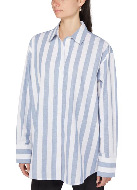 Anine Bing's Plaza shirt features a long, buttoned front closure with a classic shirt collar. Its long-sleeved design includes cuffed sleeves and buttoned cuffs, while the striped print adds a stylish touch. Visible stitching and a logo at the back label enhance its contemporary appeal, making it a versatile wardrobe piece.