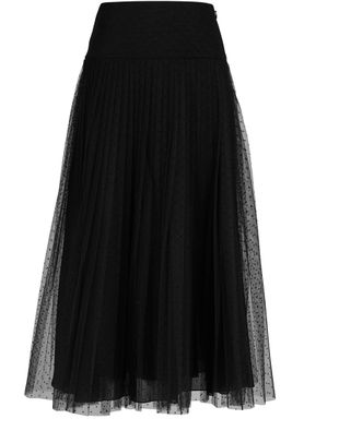 The plumetis pleated skirt is a delicate piece crafted from one of Dior’s favorite fabrics: tulle. Featuring miniature dots that create the classic plumetis fabric, this design is made to create romantic movement. With a wide waistband and zip closure that highlight the waist, this skirt can be paired with a T-shirt for a casual look, or its a Bar jacket for a complete Dior...