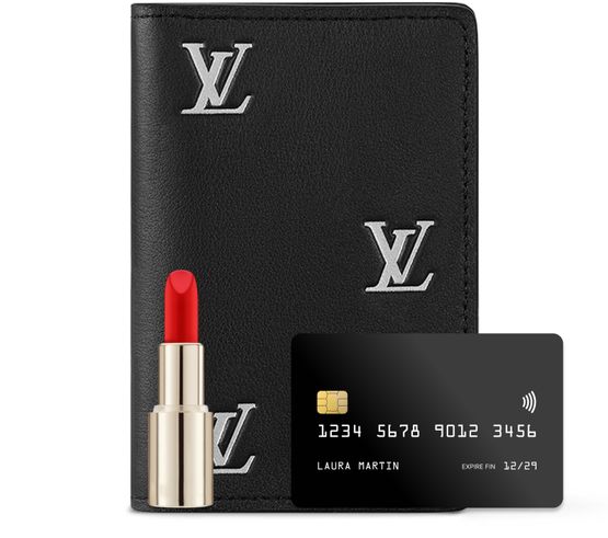 The House’s emblematic compact wallet, the Pocket Organizer, is made from fine-grained black calfskin and adorned with silver-color LV Initials printed and embossed on the leather. Part of the LV Blason capsule, with a motif inspired by George Vuitton’s original design from 1896, this wallet reflects Creative Director Pharrell Williams’ dandy chic aesthetic.