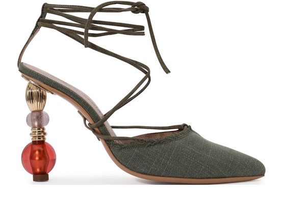 Jacquemus increasingly references its origins in the South of France with colorful, sunny references like these Portofino heeled sandals. This pointed model features a unique heel which combines large golden and transparent beads. The laces which fasten around the ankle, a common theme of the collection, ensure an optimal fit, which would complement a long dress.