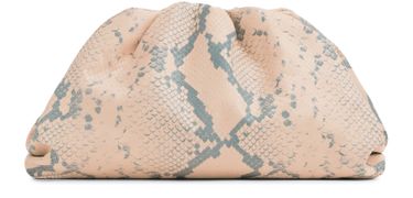 Bottega Veneta's pouch bag is crafted from smooth leather with a faded python print, giving it a distinct and trendy look. It features a single compartment and a magnetic frame closure for easy access. Designed to be worn in the hand, it is a stylish and practical accessory for any outfit.