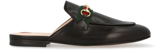 The Princetown mules are designed by Gucci. These leather shoes are open at the heel, and characterized by a colorful strap with metallic details.