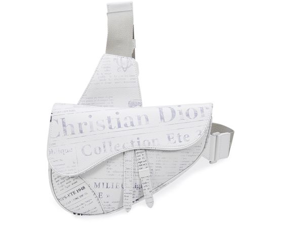 The white grained calfskin Saddle bag combines the modern attitude of the DIOR AND DANIEL ARSHAM collaboration with the vintage Newspaper print as a nod to John Galliano’s era at Dior. The adjustable ‘Christian Dior’ jacquard strap is finished with an industrial-inspired aluminum buckle, while the quintessential Saddle shape emphasizes the classic look of the piece. The interior compartment is designed to hold essentials such...