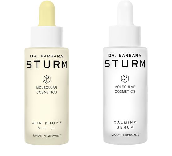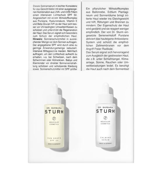 The ultimate skincare duo to protect and soothe your skin, featuring Dr. Barbara Sturm’s SUN DROPS SPF 50 and CALMING SERUM. SUN DROPS SPF 50 is an innovative light-textured sun serum that provides a truly broadspectrum SPF 50 protection against both UVA and UVB rays. An active complex of Vitamin E and Beta-Glucan protects the skin from oxidative damage, while Purslane, an anti-aging powerhouse, helps calm the skin...