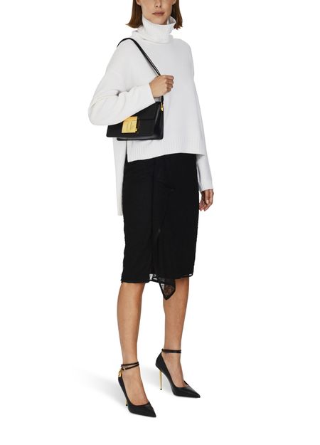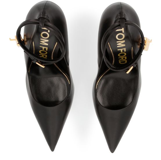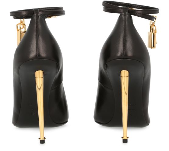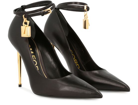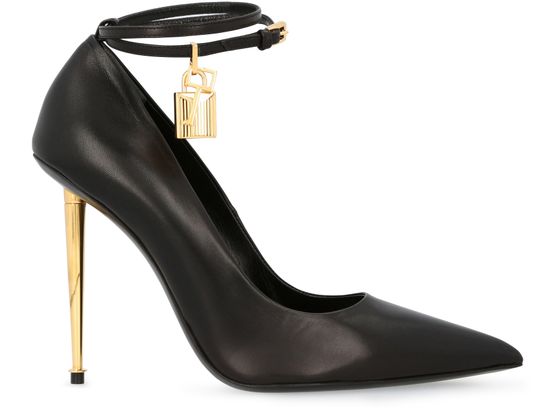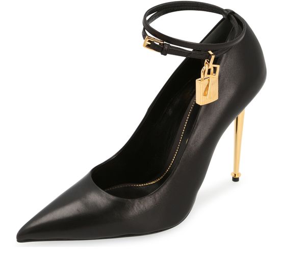 Tom Ford has designed these high-heeled pumps as if they were jewels. The foot rests on a golden heel, the ankle is encircled by a buckled strap punctuated by a padlock.