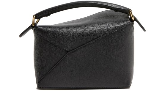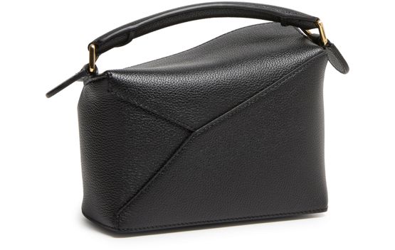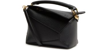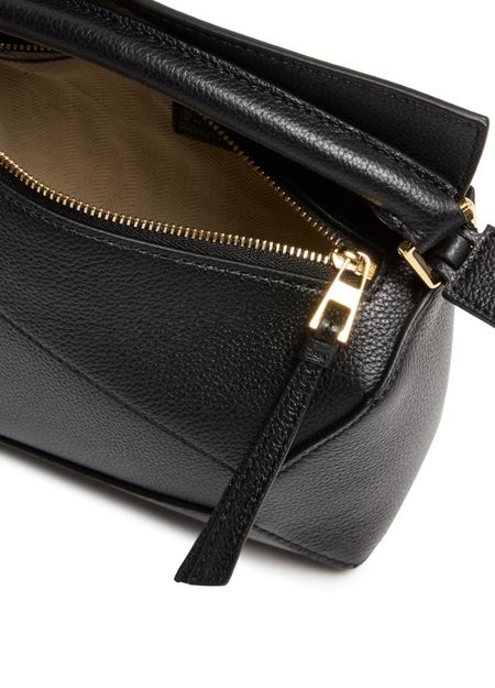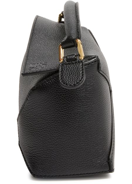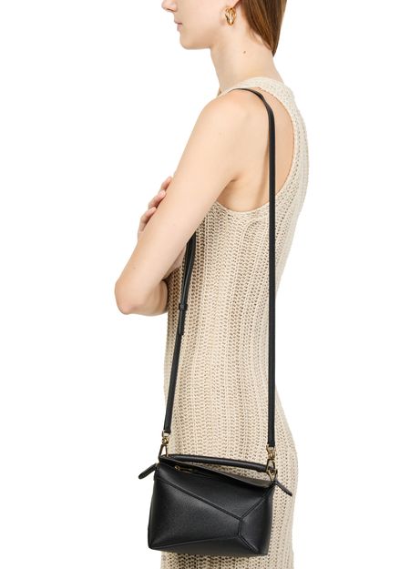 Reveal Loewe's Puzzle Edge mini bag, crafted from grained leather with a single handle and thin, adjustable strap for versatile wear. The zippered front pocket and flap closure combine with visible topstitching, showcasing refined craftsmanship and modern design in a compact silhouette.
