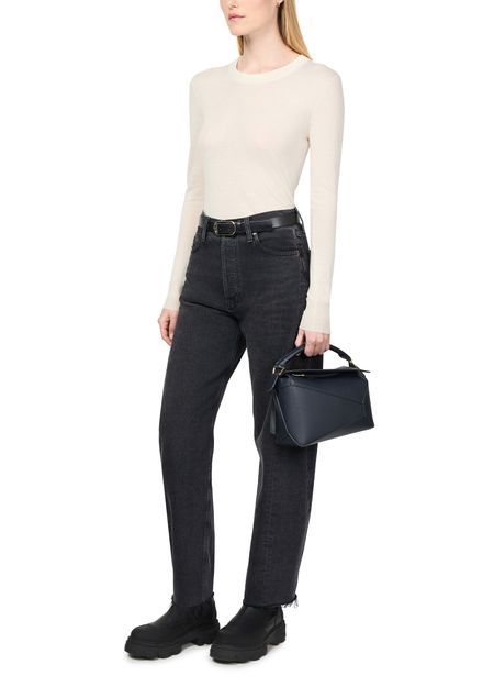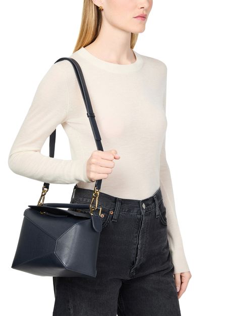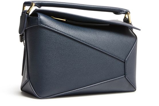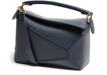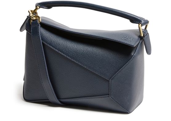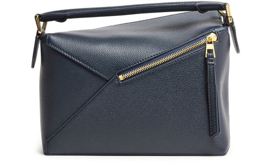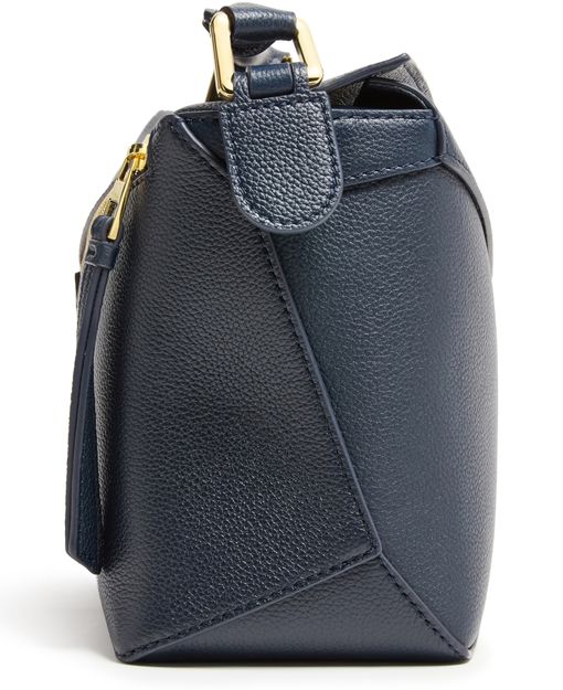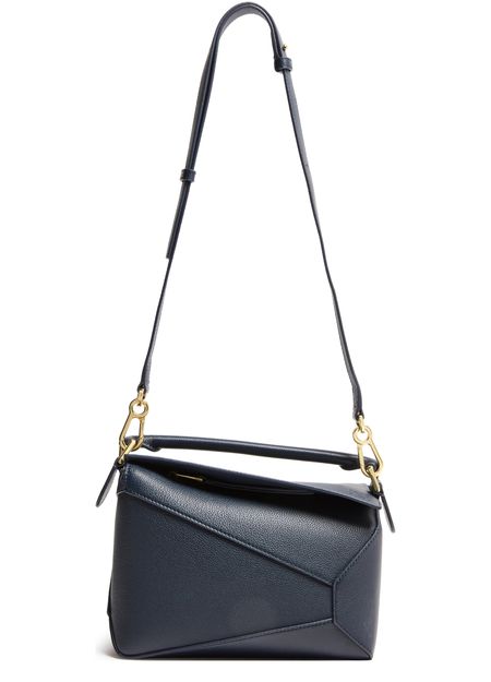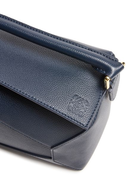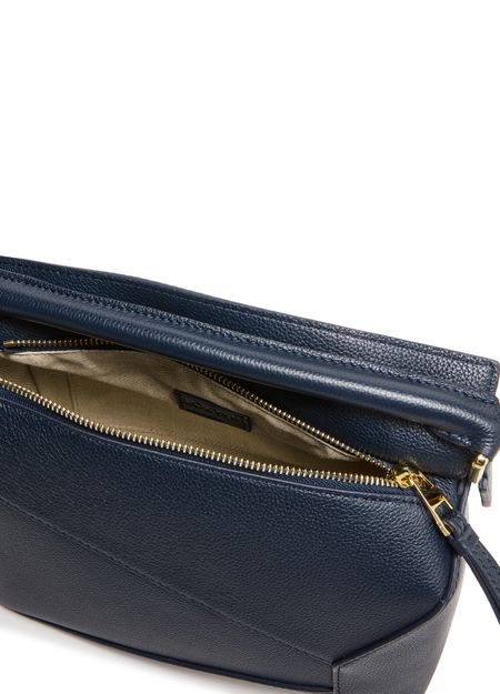 Loewe's Puzzle Edge small grained calf leather bag showcases a sleek design with a zipper closure and a single compartment for essentials. Its gold finish adds a touch of elegance, while the visible topstitching highlights craftsmanship. Hand carried or worn with a wide strap, it’s the perfect blend of style and functionality.