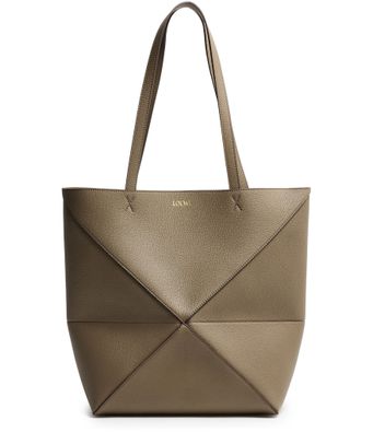 Unveil Loewe's Puzzle Fold medium tote bag, a masterpiece crafted from grained leather. This tote boasts a spacious interior compartment and features double handles for versatile carrying. The elegant design is completed with visible topstitching and a front logo in gold letters, reflecting timeless sophistication.