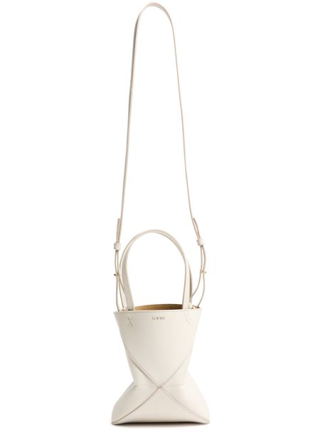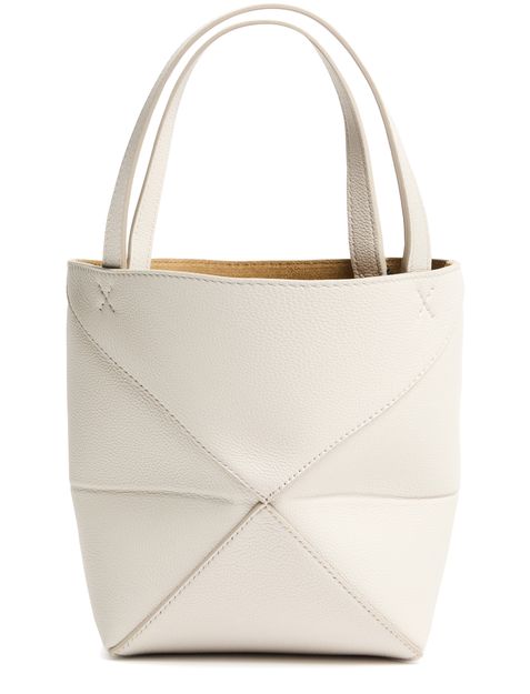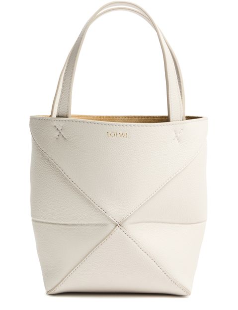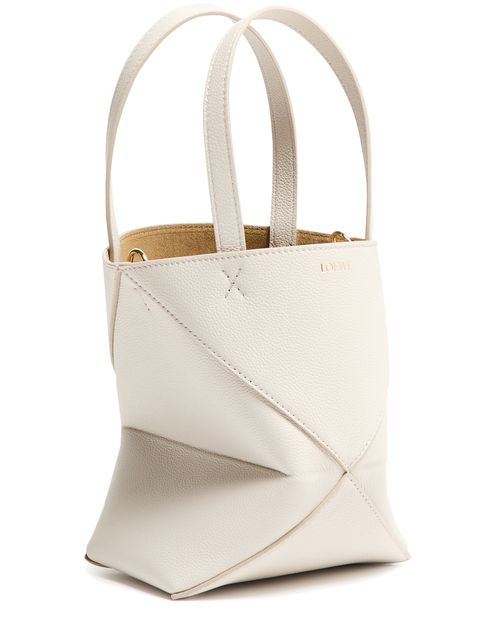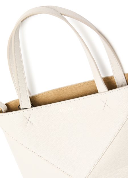 Unveil Loewe's Mini Puzzle Fold tote in soft grained leather, where elegance meets functionality. This tote features double handles and a spacious interior with a pocket for organization. Notable topstitching and a front logo add a sophisticated touch, perfect for any modern ensemble.
