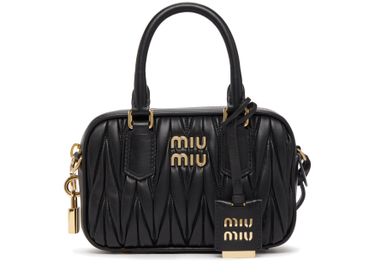 Miu Miu's Arcadie matelassé nappa leather bag is a chic and versatile accessory. Crafted from chevron quilted leather, it features leather handles, a thin strap, and gold metal finishes. The metallic logo on the front adds a touch of luxury, while the zipper closure ensures your belongings are secure. This bag can be hand carried, worn on the shoulder, or crossbody for effortless style.