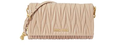 This quilted bucket bag is designed by Miu Miu. This leatherwork accessory's contemporary design reflects the Italian house's feminine, sophisticated identity.