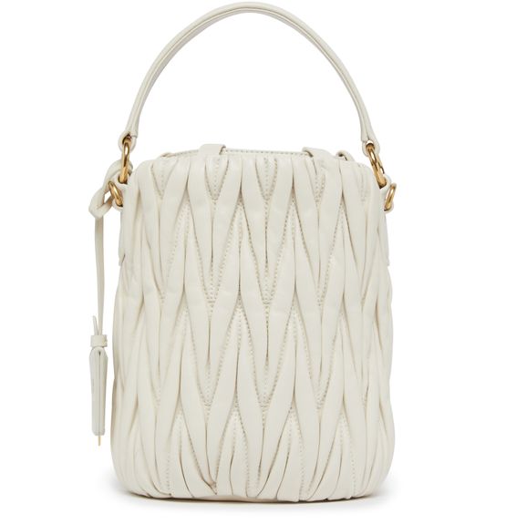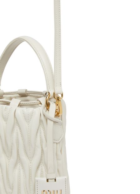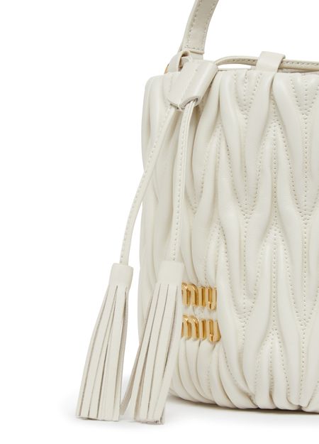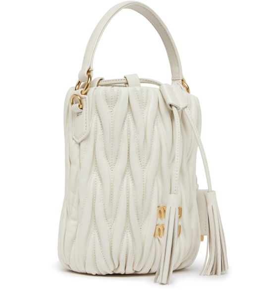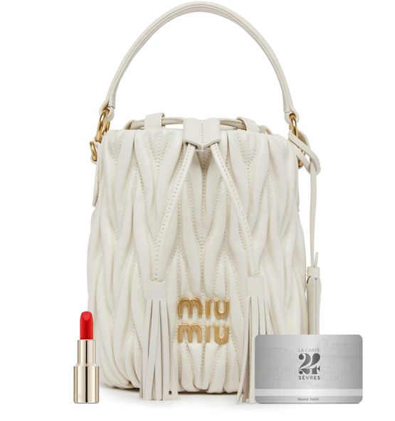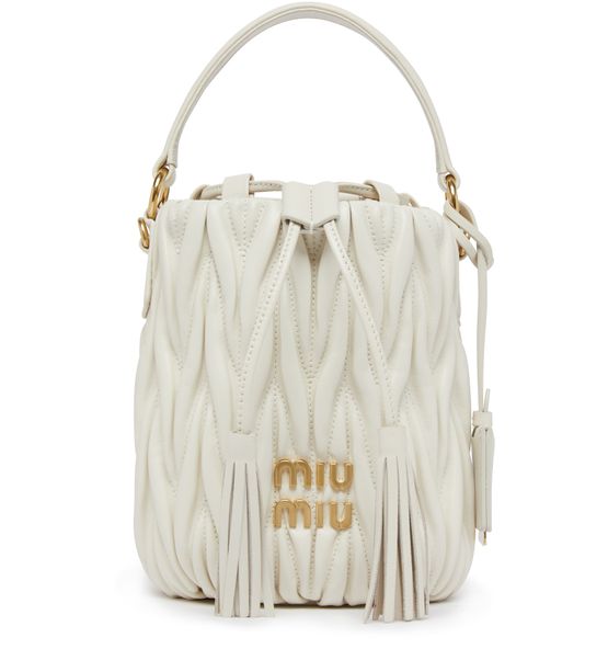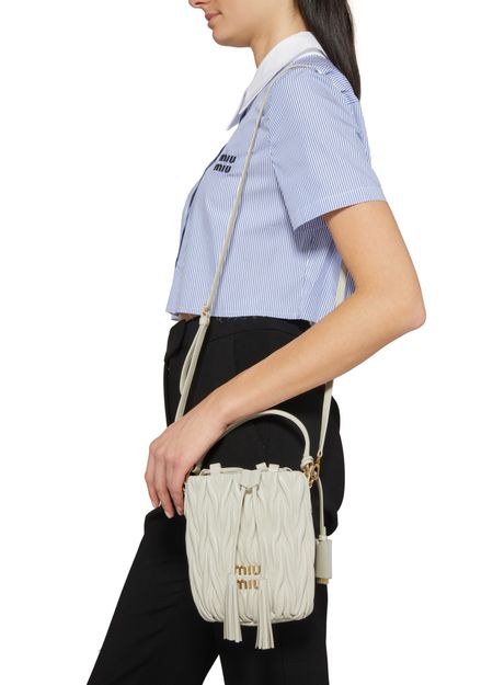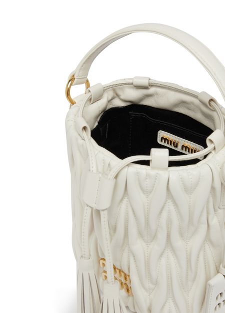 • Description : thin strap, worn on the shoulder, gold finish, drawstring closure, metallic logo on the front, logo in gold letters, detachable strap, carabiner, tassel details, zippered interior pocket.