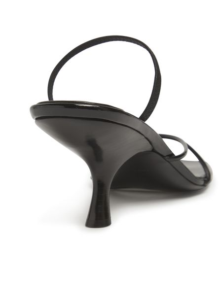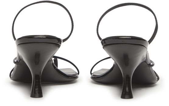 • Description : Smooth leather, open square toe, sleek shape, rear strap, logo-printed insole, comma heel.