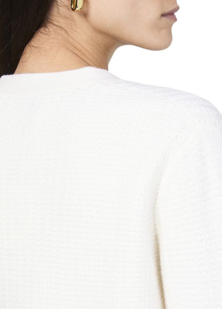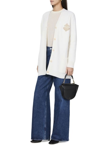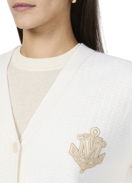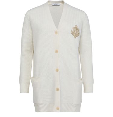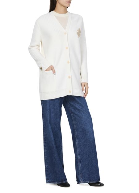 Max Mara's Ravello cardigan showcases a long silhouette with a flattering v-neck and front buttoned closure. Its long-sleeved design features cuffed sleeves for a refined touch. An appliquéd logo adds a subtle hint of luxury, making this piece an essential layering option for any stylish wardrobe.