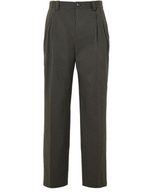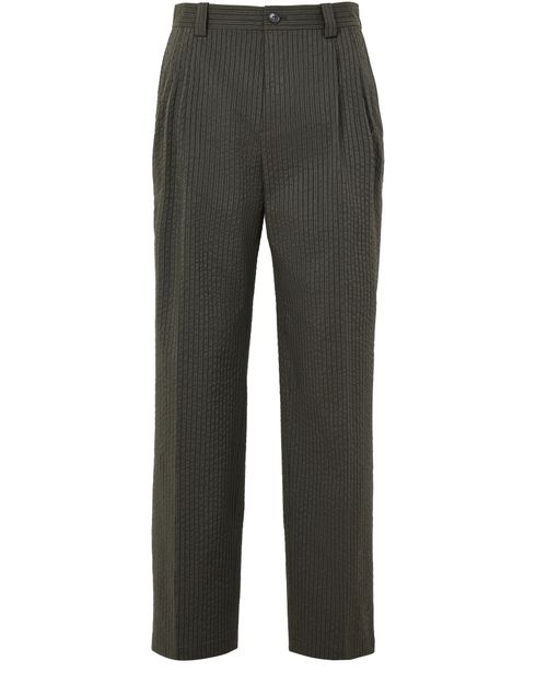 Description : striped print, buttoned and concealed zipper closure, visible stitching, embroidered logo, logo at the back, belt loops, two front pockets, side pockets, flap pockets, back pocket.