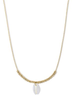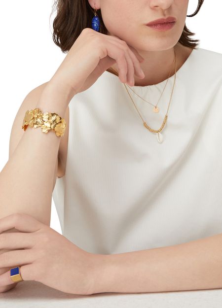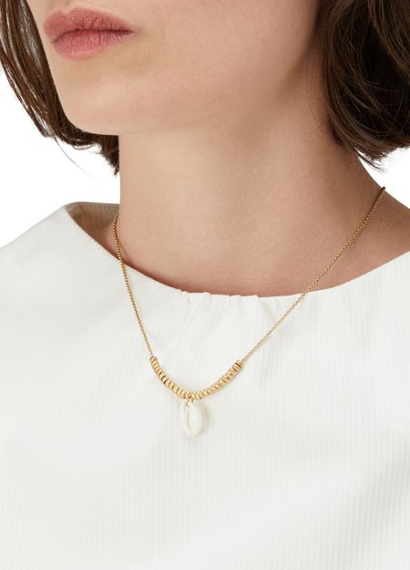 The Medecine Douce style reinvents itself here with this exotic René necklace. The choker is adorned on the front with small textured rings along with a contrasting cowrie shell pendant. A veritable invitation to escape, this necklace goes great with its matching earrings and ring.