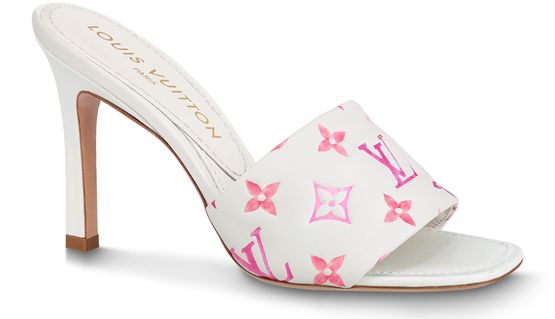 This seasonal edition of the Revival mule is crafted from extremely soft lambskin. Its wide front strap is debossed with the Monogram pattern in a gradation of summery shades coordinating with the leather goods collection. This model is finished with an elegant high heel and a fine leather outsole.